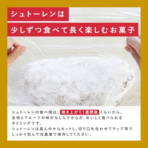 このキットに含まれる材料は乾燥状態であり、賞味期限が120日と長いため、長期保存が可能です。また、このキットを使用して作られたシュトーレンは、伝統的な製法により熟成させることで風味が深まる特性を持っています。キットを通じて、その熟成のプロセスを自宅で体験し、時間と共に変化する味わいを楽しむことができます。適切な保存により、クリスマスの時期まで美味しさを保つことが可能です。