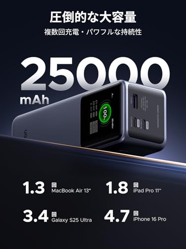 このUGREEN Nexode PB722は、25000mAhの大容量と最大200Wの高出力を両立した高性能モバイルバッテリーです。特にPD3.1 140W出力は、ミニPCや高性能ノートPCの充電・給電にも対応し、一部のスタッフからは「ミニPCのUPSになる」と評価されるほどです。ただし、端子の抜き差しで瞬断する可能性があり、使用時には注意が必要です。ディスプレイの保護フィルムやケースが別途必要になる場合がある点も考慮すべきです。一部のユーザーからはiPhoneの充電回数について公称値との乖離が指摘されていますが、全体的にはその大容量と高出力、多機能性から高い評価を得ています。24ヶ月の保証期間も安心材料です。