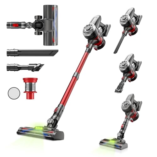 50000PAの超強吸引力と自走式設計、緑色LEDライトを搭載したコードレス掃除機。最大50分稼働、着脱式バッテリー、1.2L大容量ダストカップ、水洗い可能で、多様なノズルが付属し、家中を快適に掃除できます。